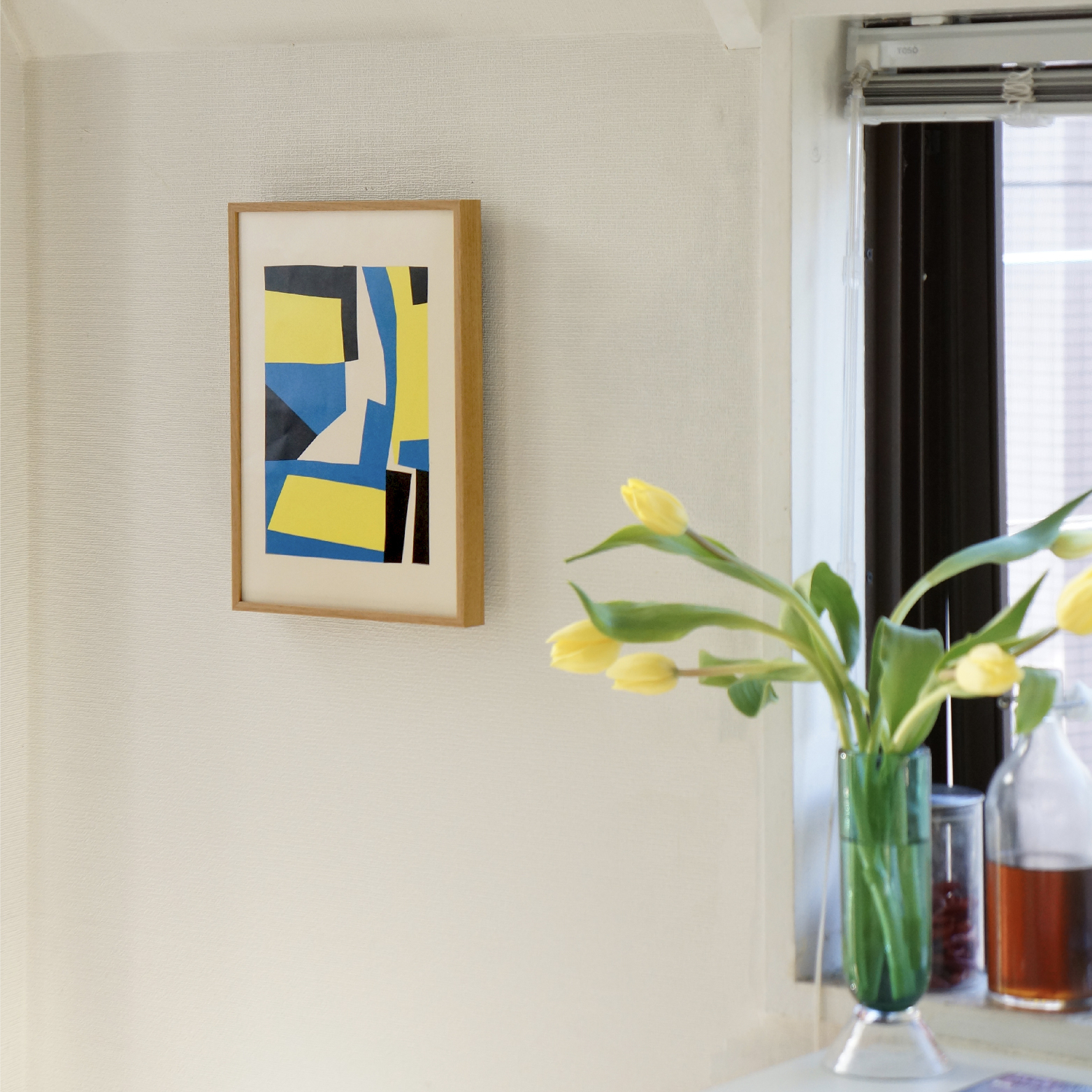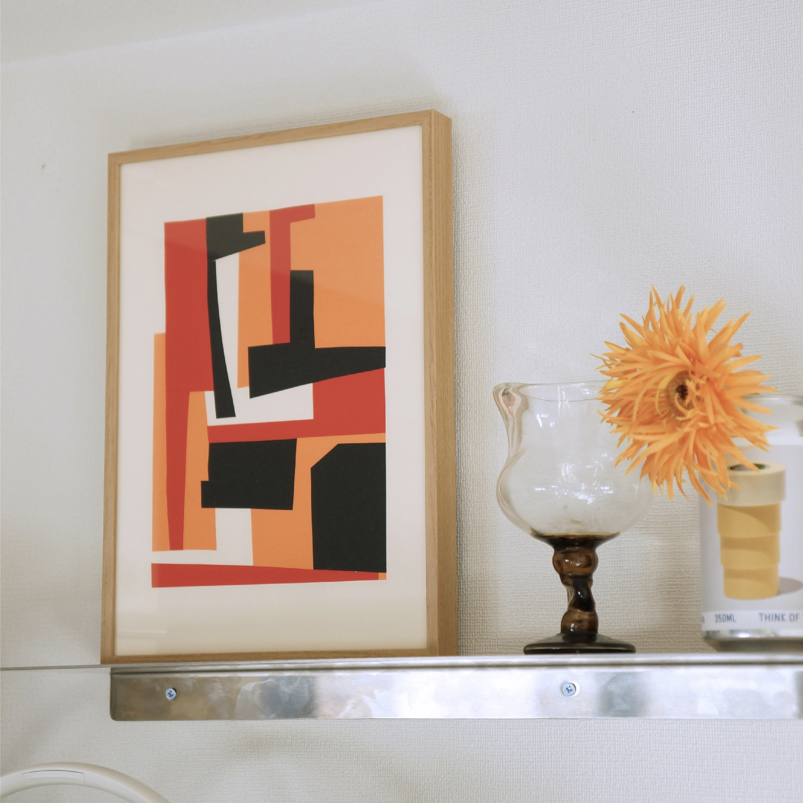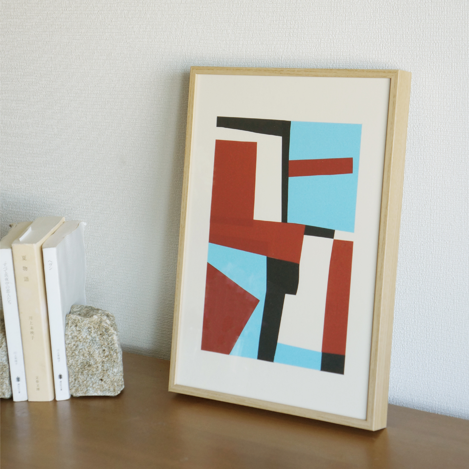 折り紙をケント紙に貼り合わせた切り絵作品を、紙の質感や貼り合わせた重なり、切れ目を活かしながらプリント作品に落とし込みました。飾りやすいサイズ感とあたたかみのある作品性は、どんな空間にも心地よく馴染みます。かたちの重なりから何を連想するか、どこに飾りたいか、作品が「はなす」きっかけとなり、暮らしを明るく彩ることを願っています。