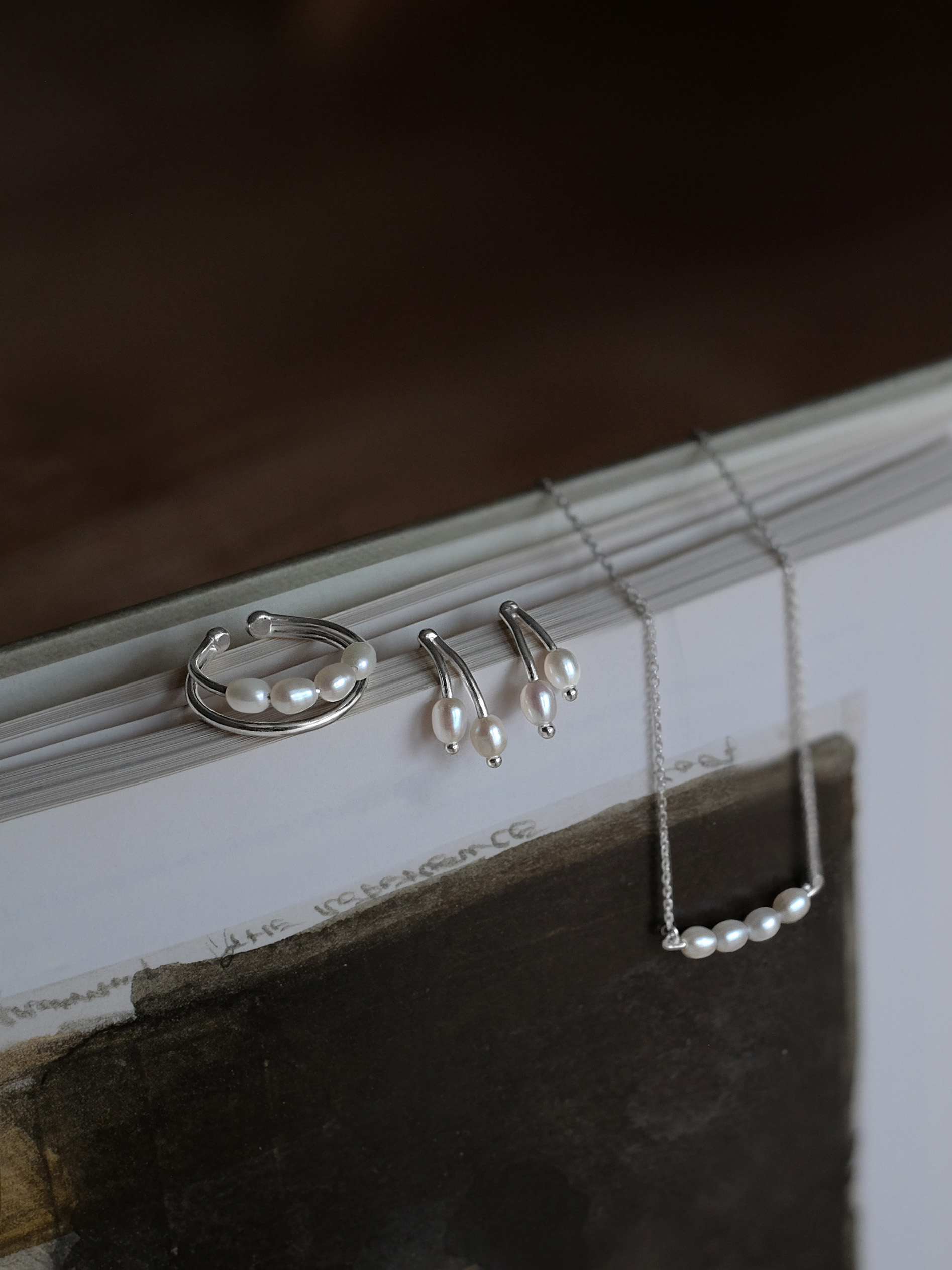素材はsilver925をはじめ、純銀、淡水パール、天然石を使用。手仕事ならではの風合いを大切に、ひとつひとつ丁寧に制作しています。