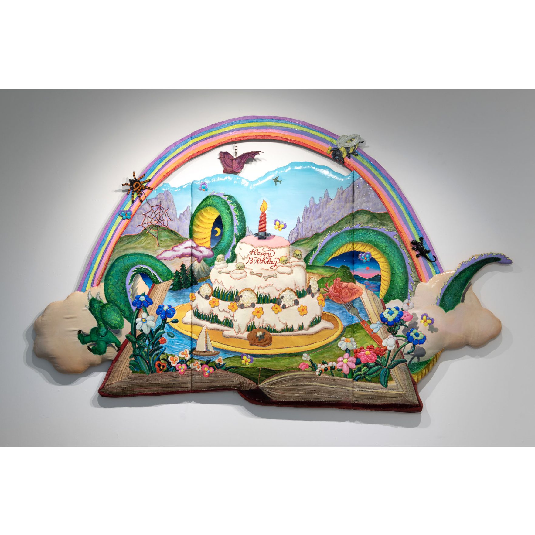 死生観や信仰、民間伝承を背景に、マンガやアニメなど現代的モチーフを融合し、時空を超えた神話的世界を描く。人間と自然の共生や治癒と破壊の循環をテーマに、獣の皮膚や毛を素材に制作。その表現は、ウルトラ怪獣の縫い目や寺山修司作品の極彩色の濃密な昭和の質感に、ポケモンやたまごっちの滑らかな平成的フォルムを重ね、異なる時代感覚を融合させた独自の造形世界を構築している。