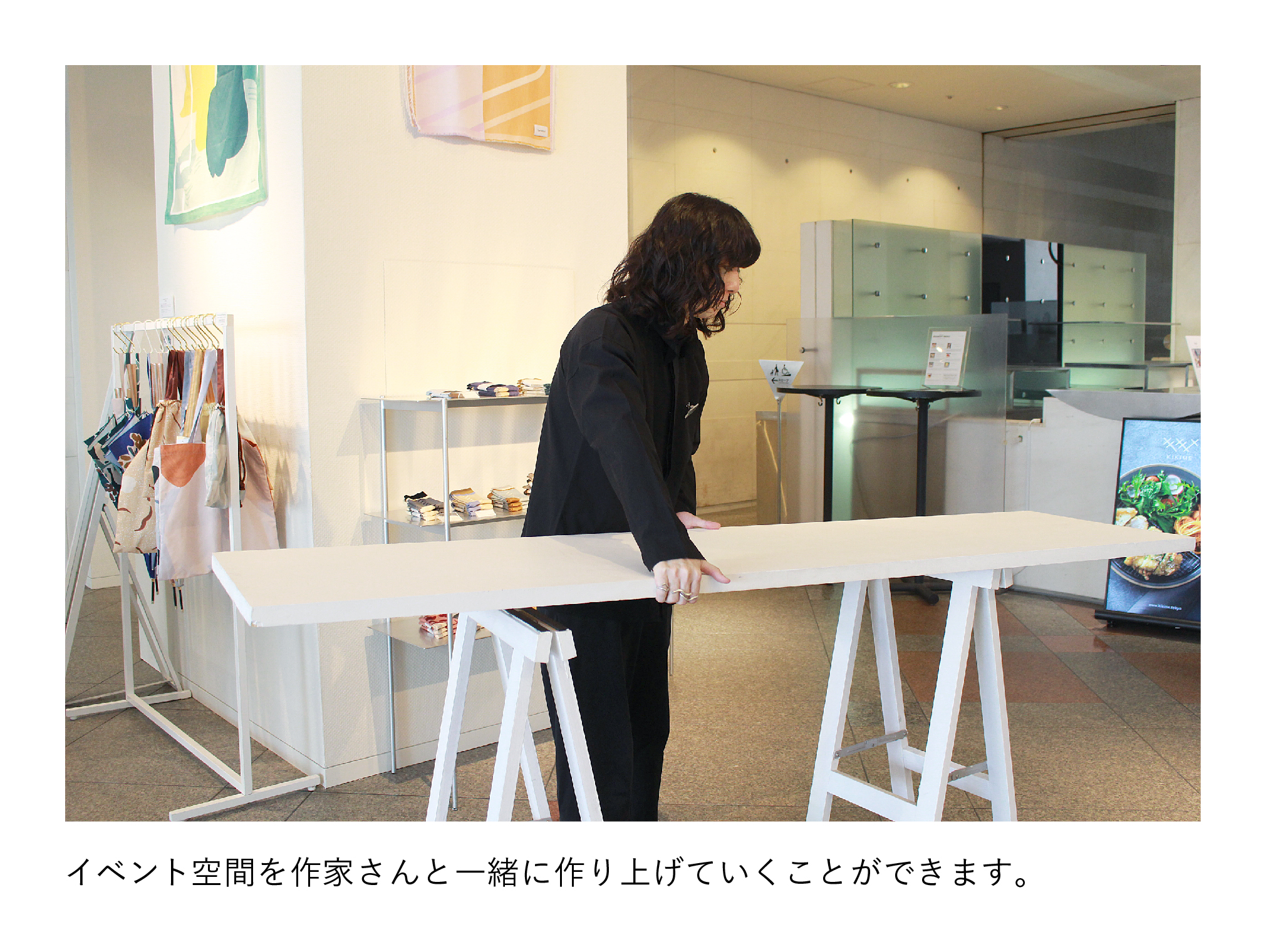 作品にこめられた作り手の想いや制作背景をお客さまにお伝えする販売業務から始まり、イベントの計画や作家の誘致、搬入から設営作業まで、企画立案からお客様へお届けするまでの一連の業務に携わることができます。