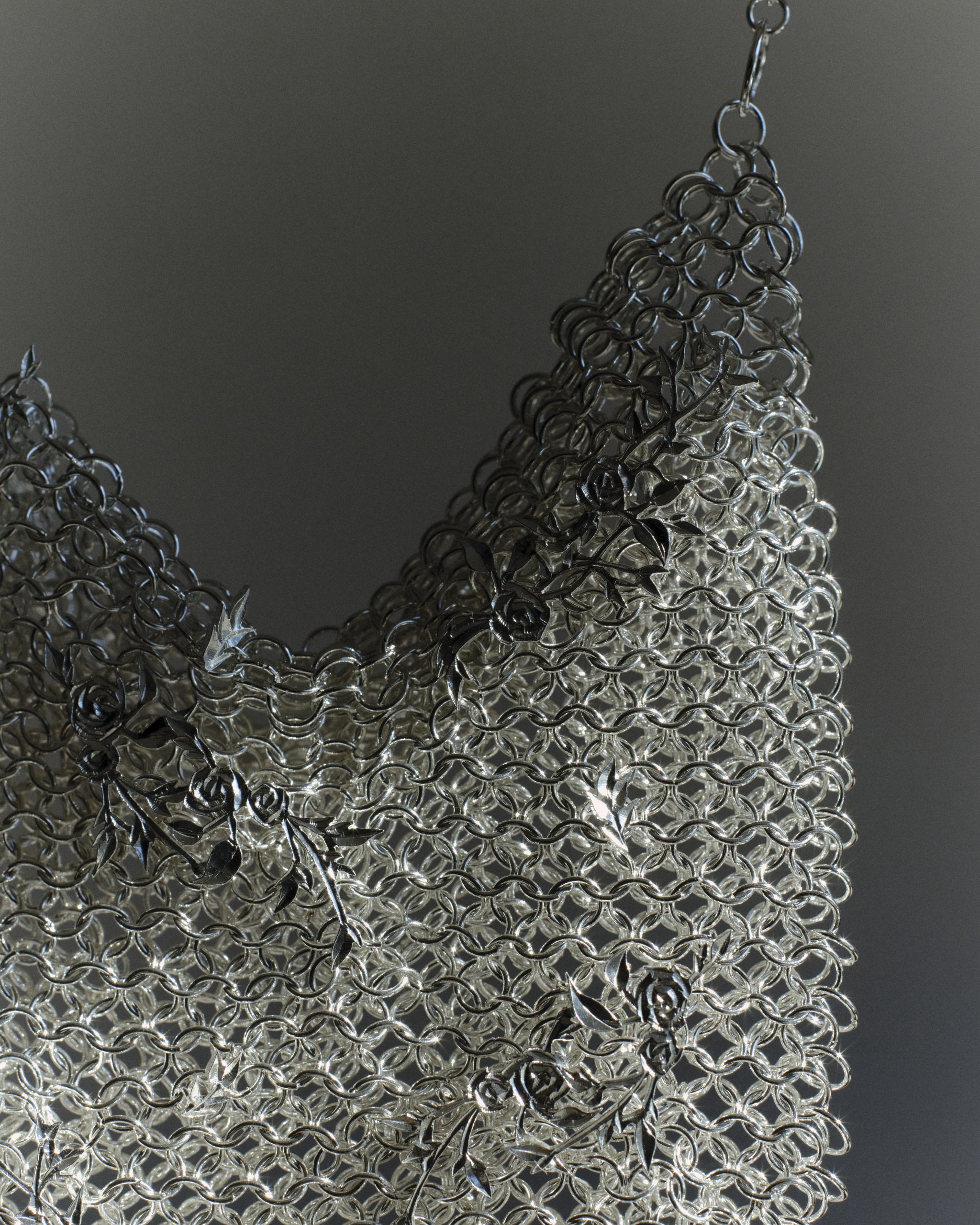 鎖帷⼦のようなメッシュ状のものは、マルカンで繋ぎ、模様のパーツで装飾を施した。
