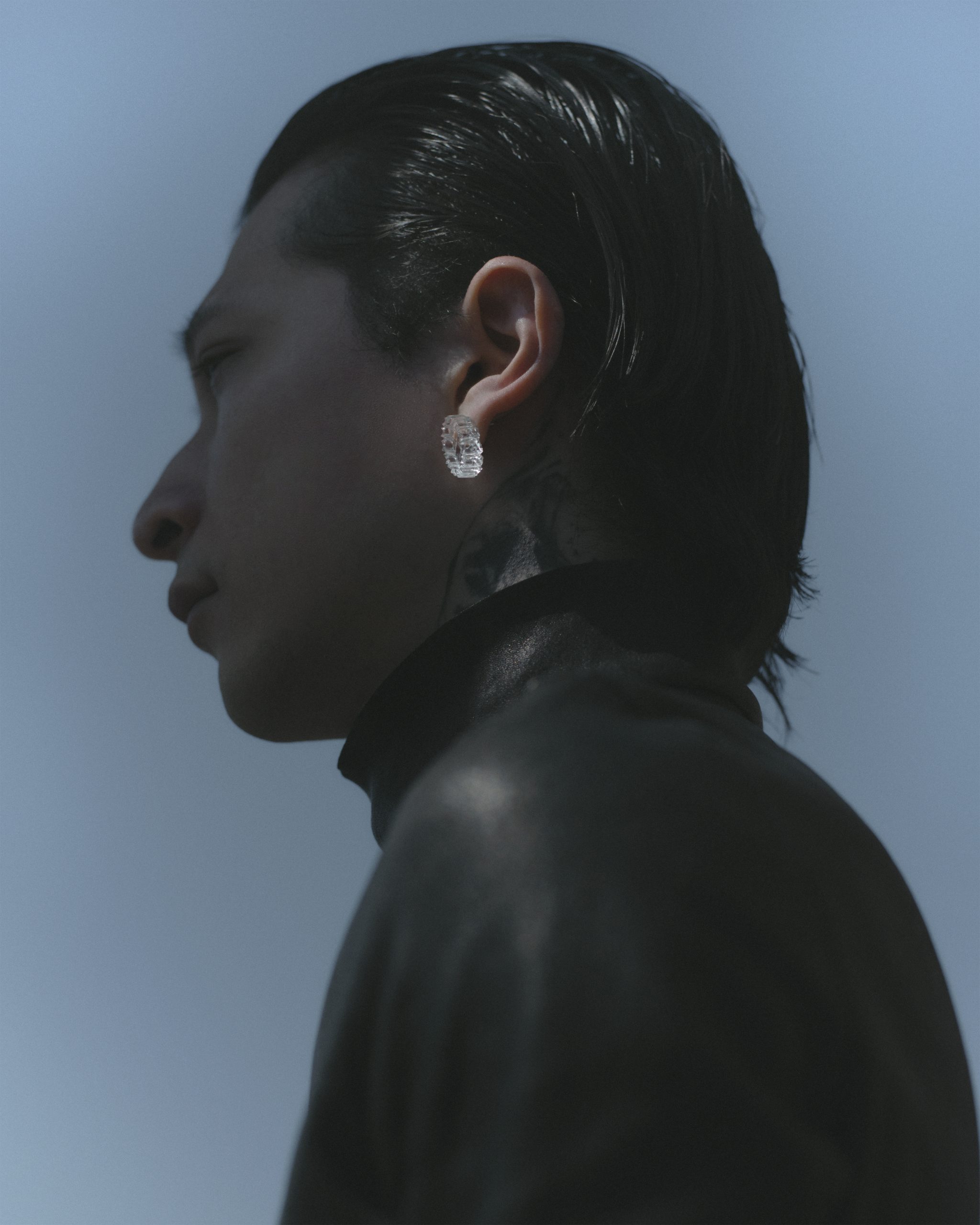 水晶彫刻で、ひんやりとした静けさを感じる小さな器のように形作られたピアス。