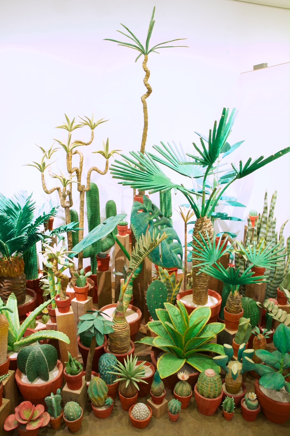 山崎悠人は、主に植物をモチーフとした彫刻作品を制作しています。一木から削り出された大胆でうねりのある茎と、葉や花はあえてつなぎ合わせる構造を取り入れることで、接ぎ木の植物のような、不思議で生命力を感じる造形美があります。