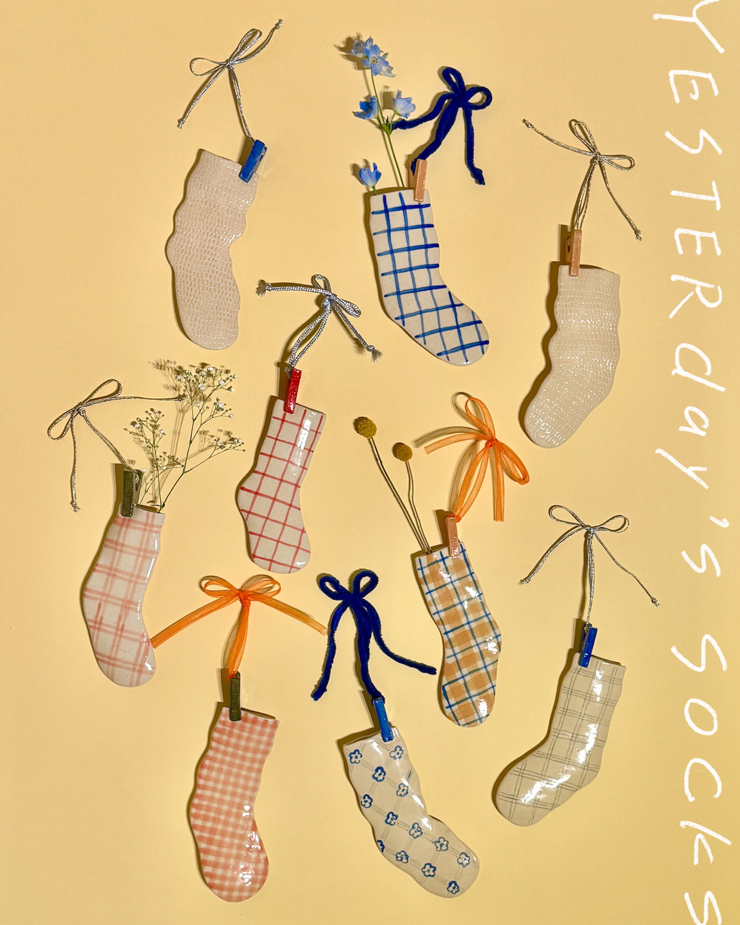 普段は布と陶という異なる素材で制作を行う2作家。本展のために共同制作されたアートオブジェ〈モビール〉が会場を彩り、布のやわらかな表情と陶の持つ質感が心地よく響き合います。