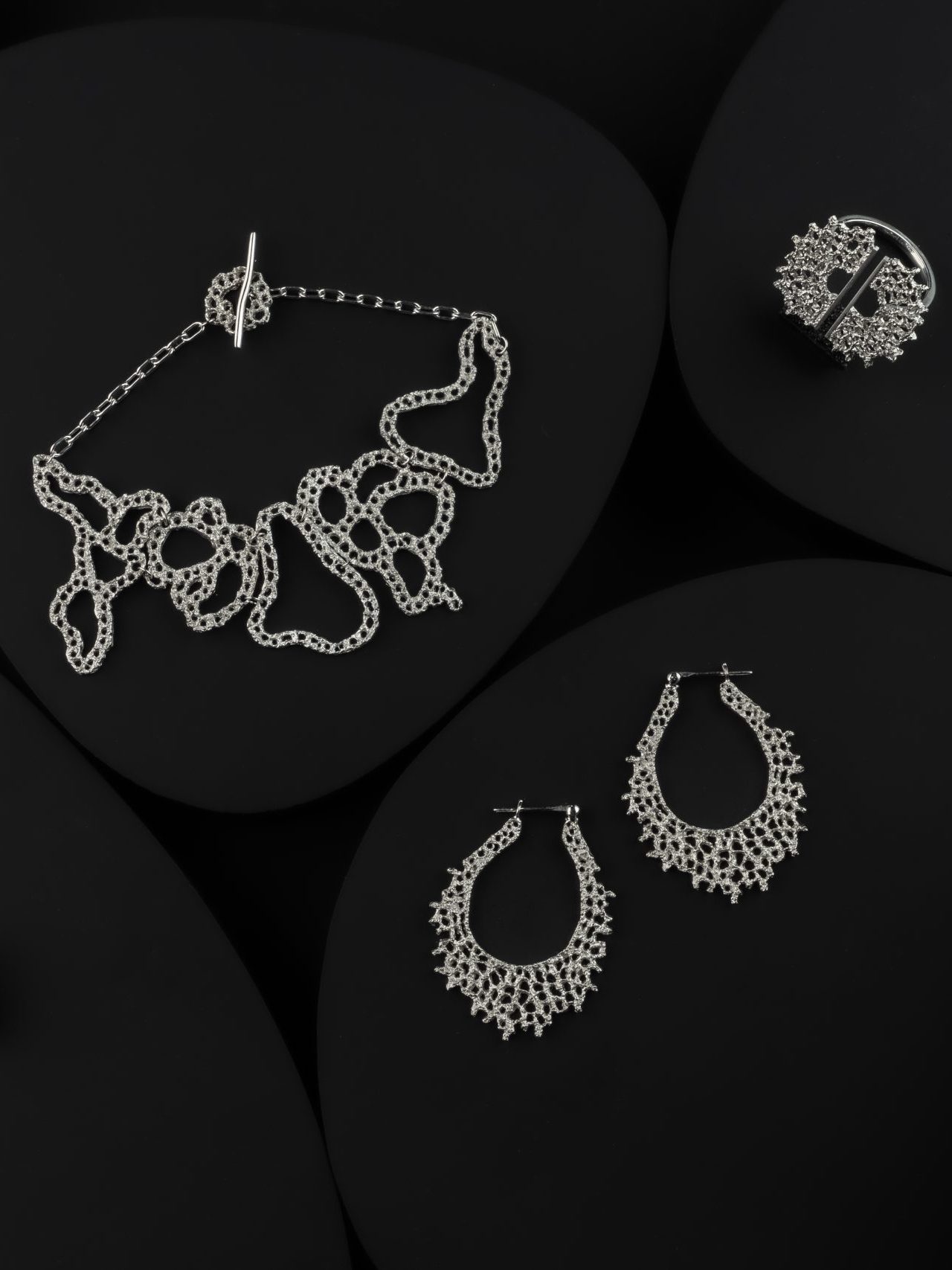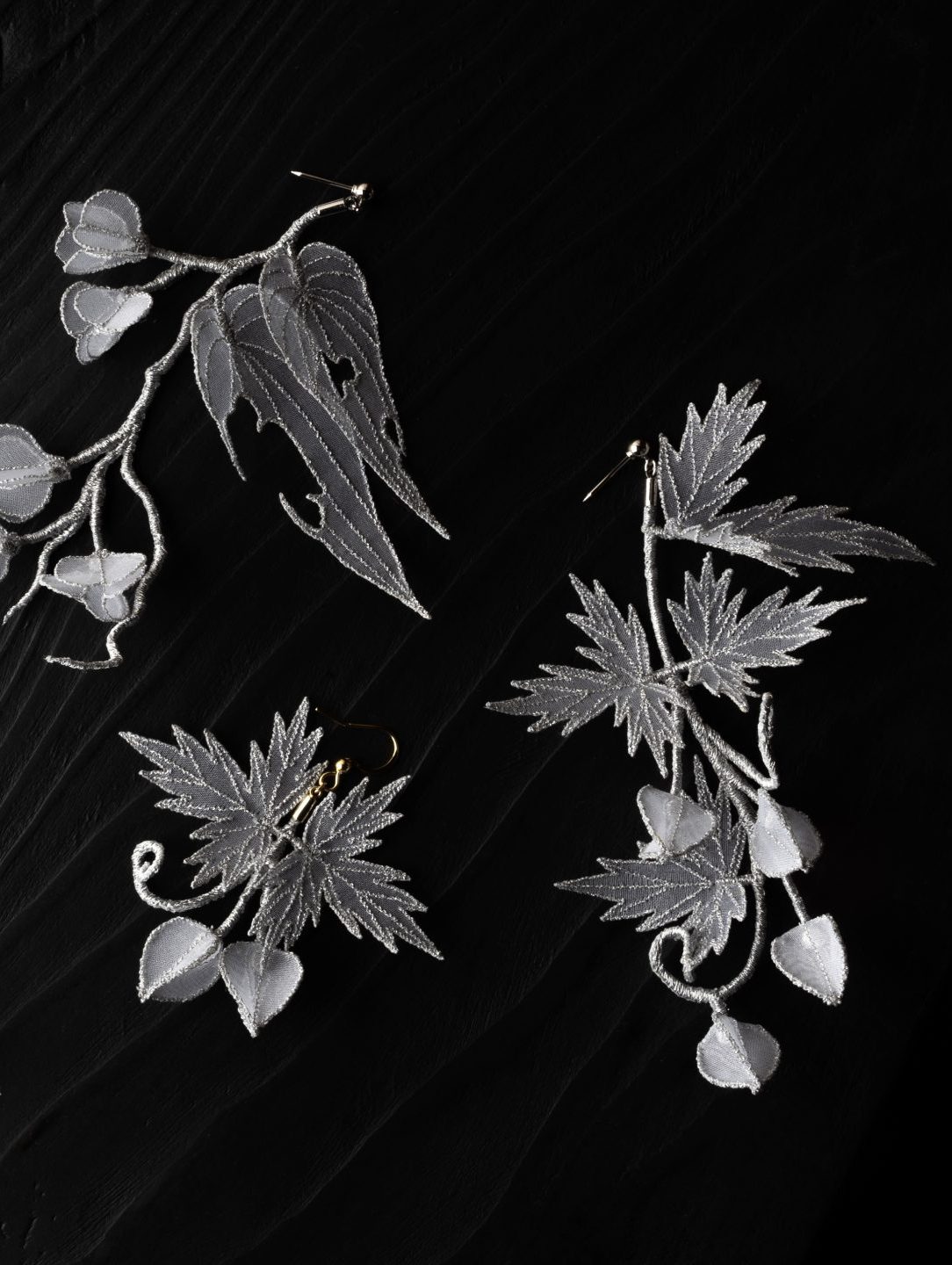 長く受け継がれてきた伝統工芸を新たな視点から捉え、「刺繍」の既成概念に縛られない構造と立体感によって、植物の美しい表情を切り取り、現代的なジュエリーへと昇華させている。