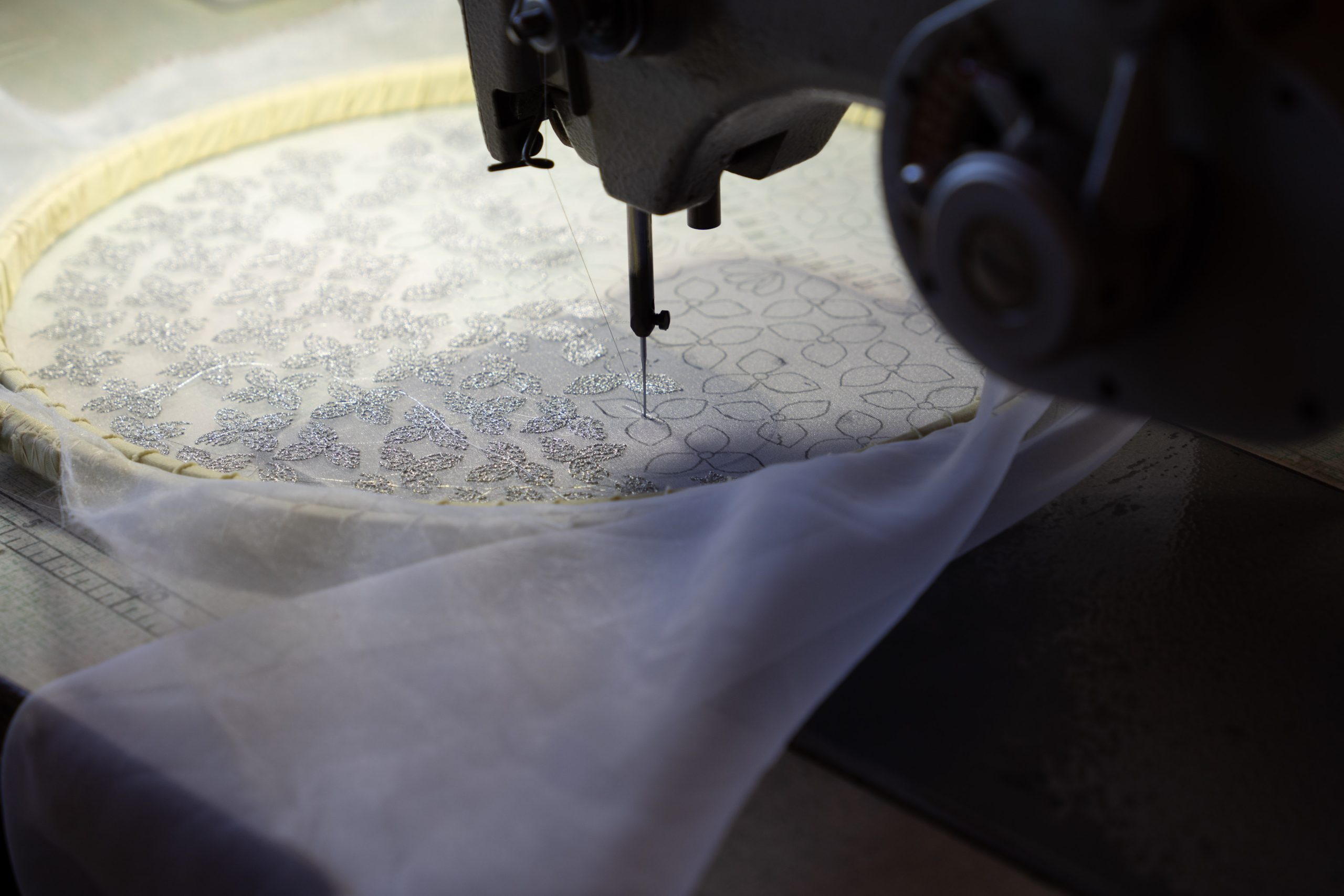 作品は、約70年前に製造されたJUKI製の横振り刺繍ミシンを用い、一点一点丁寧に仕立てられている。