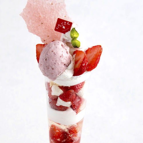 いちごさんを使用した自家製のソース、ジェラート、チュイールなどを盛り込んだ期間限定のパルフェ。