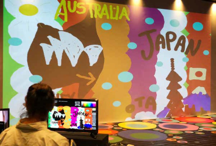 日本初公開となる本プロジェクトでは、太田からシドニーに、シドニーから太田に、お互いにアーティストを派遣、それぞれの会場に設置された大きな壁に、2人のアーティストと現地の子どもたちで一緒に絵を描くとともに、インターネットで両会場を結び、リアルタイムで交流を行ないました。市内小学校への協力を呼び掛け、希望によって選ばれた6校の児童のほか、一般公募で参加した計900名にも及ぶ多くの子どもたちが体験しました。