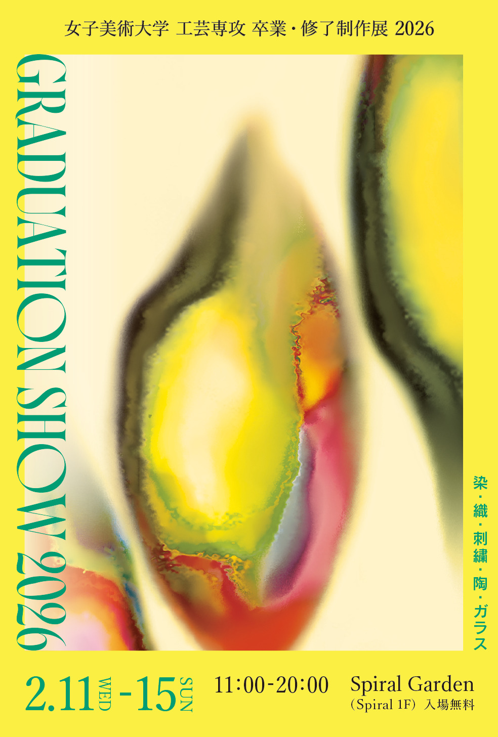 染、織、刺繍、陶、ガラスの5分野による卒業・修了制作展です。