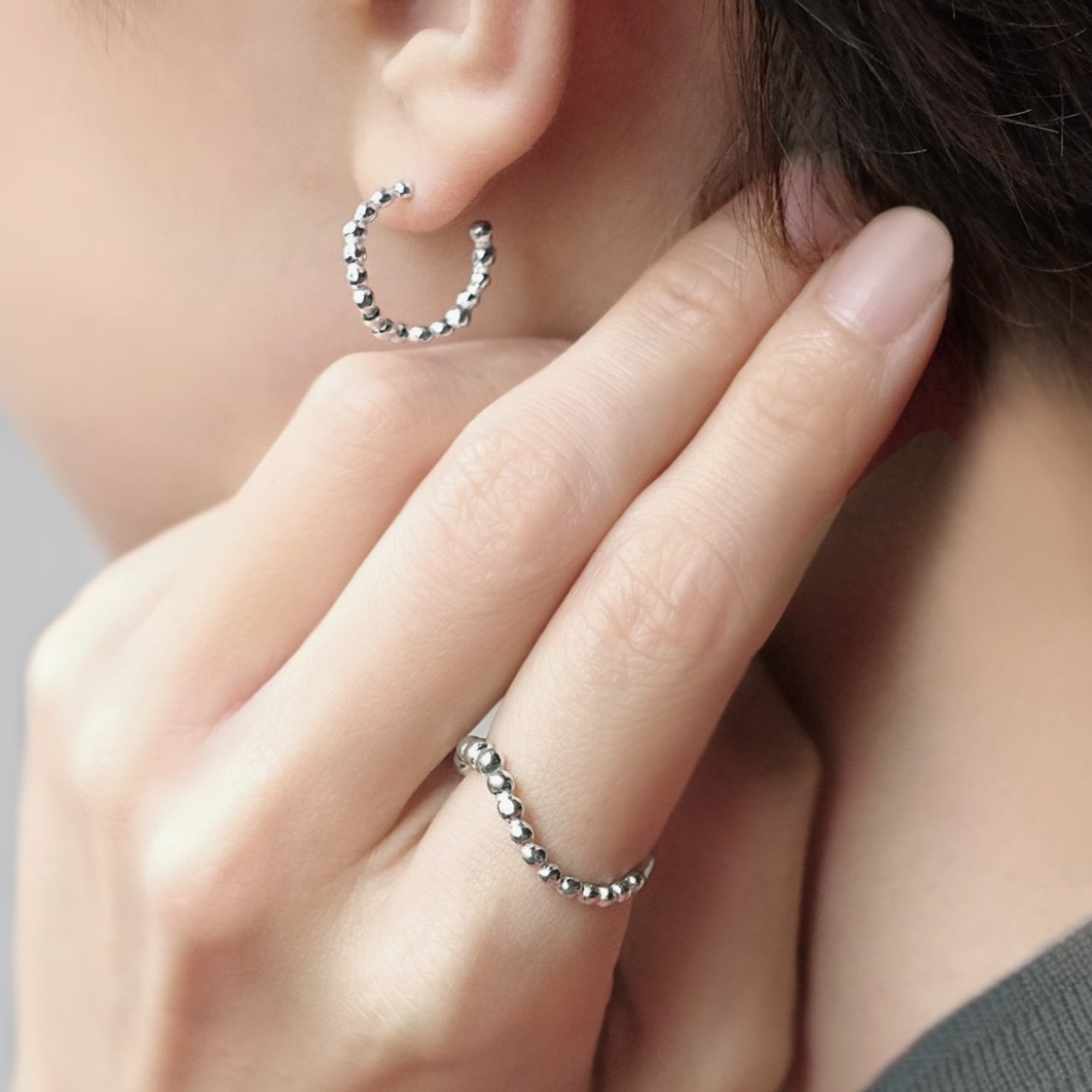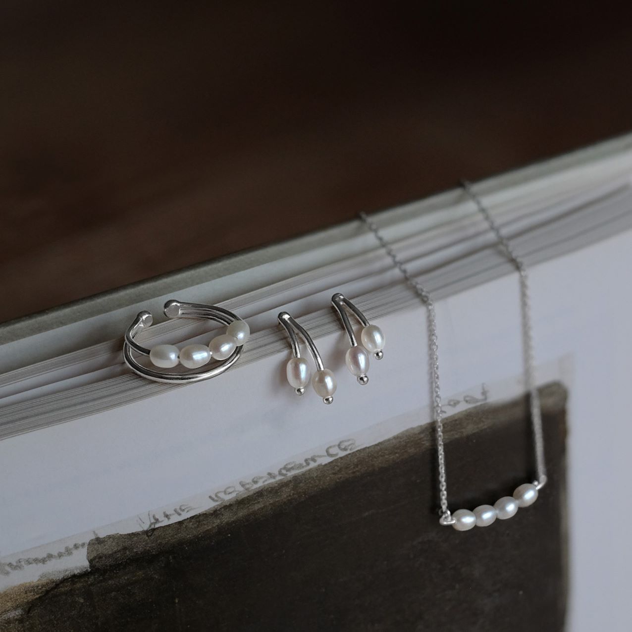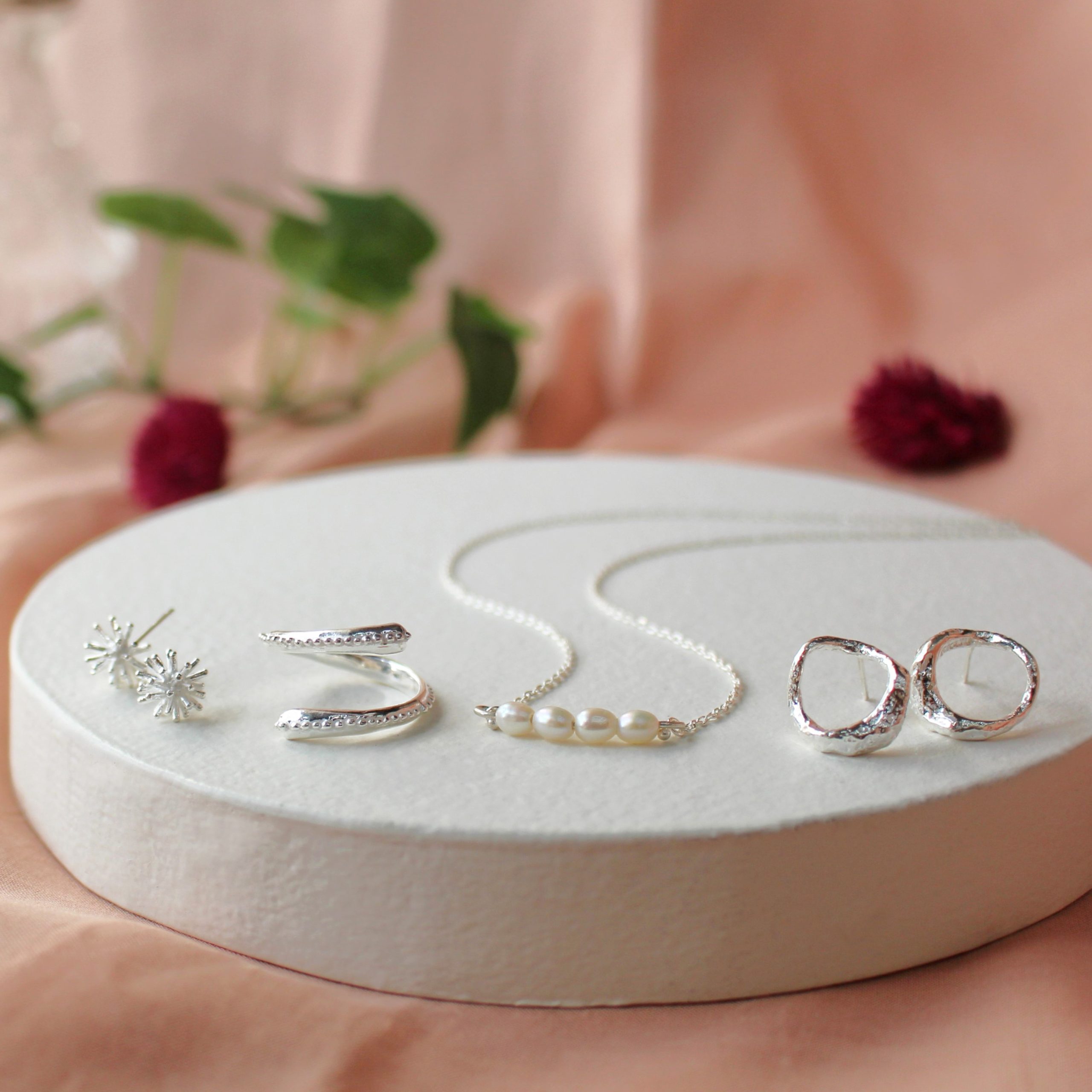 素材はsilver925をはじめ、純銀、淡水パール、天然石を使用。手仕事ならではの風合いを大切に、ひとつひとつ丁寧に制作しています。