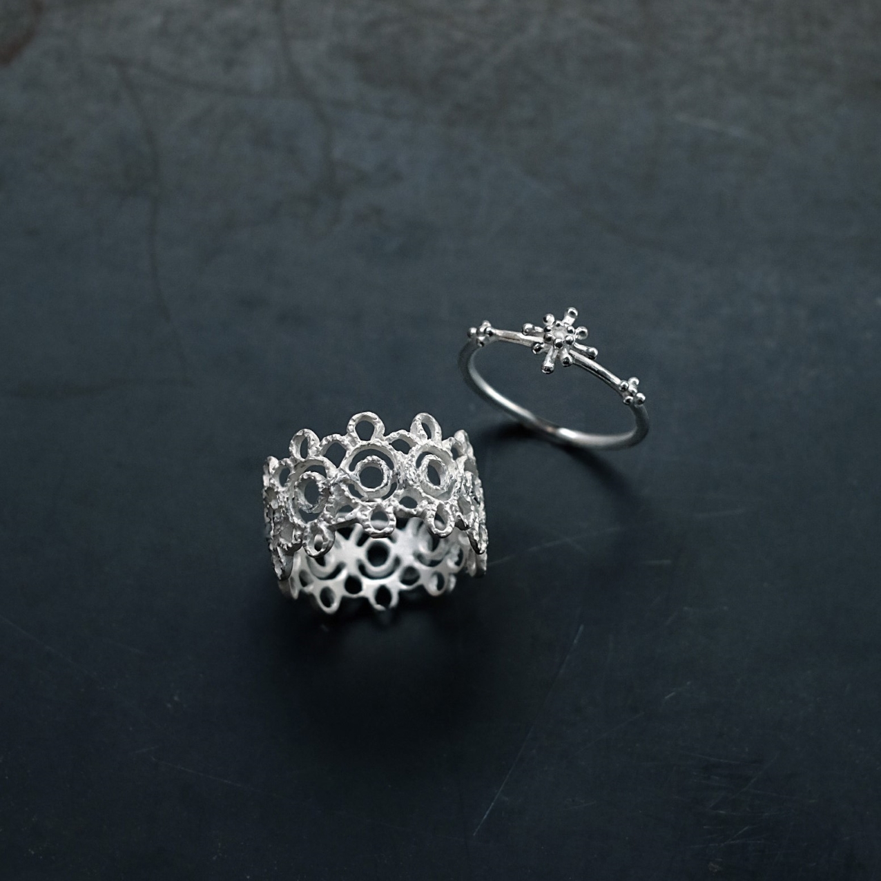 独自の白上げマット加工、金槌によって生み出される独特なテクスチャ、表面を粗く削った仕上げなど、多彩なシルバーの表情が魅力。