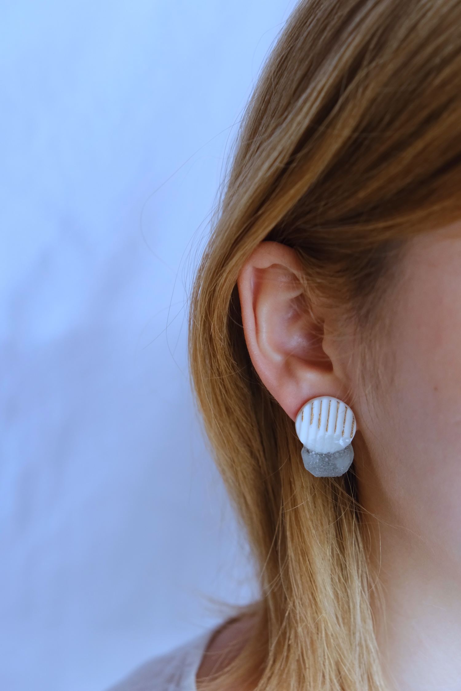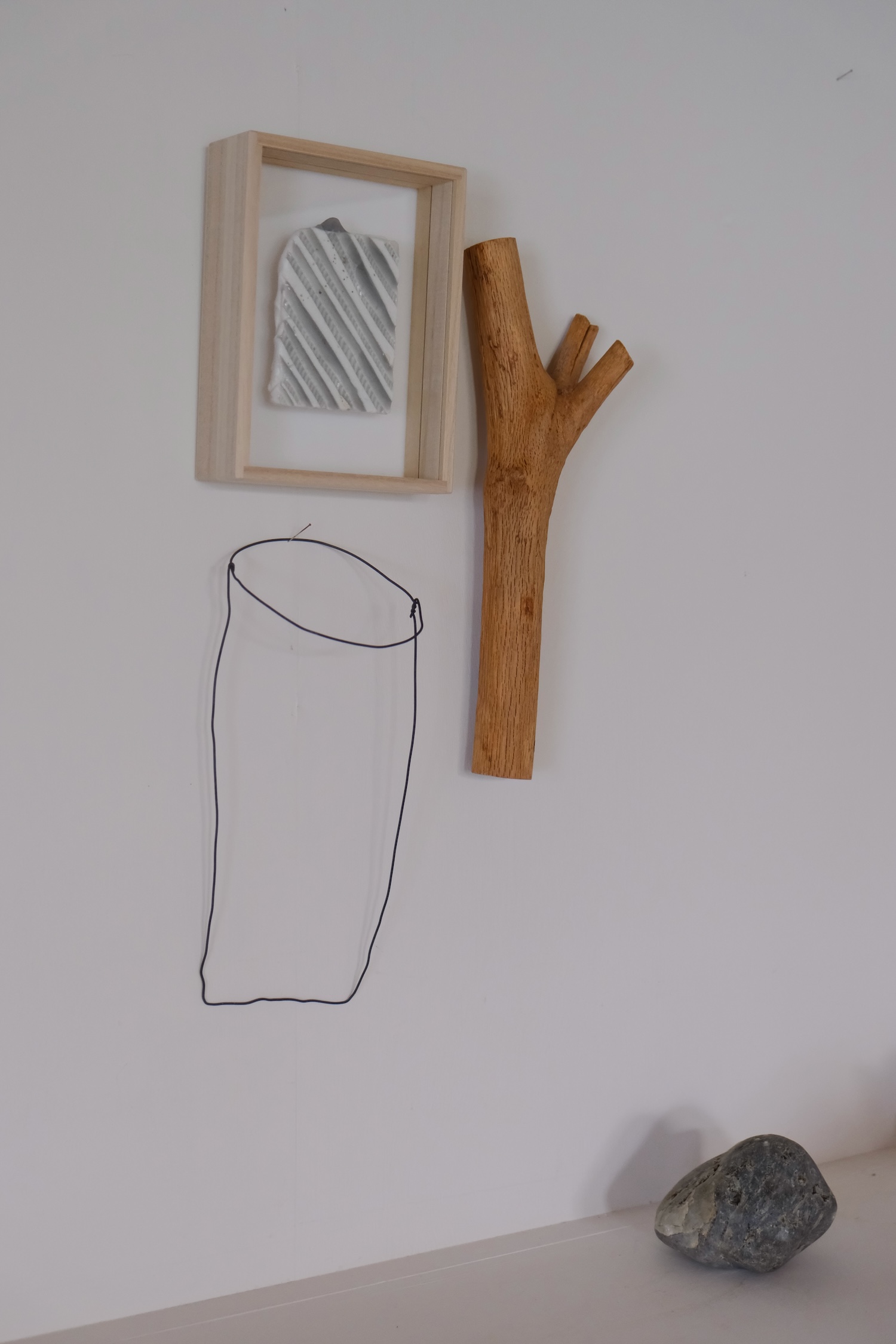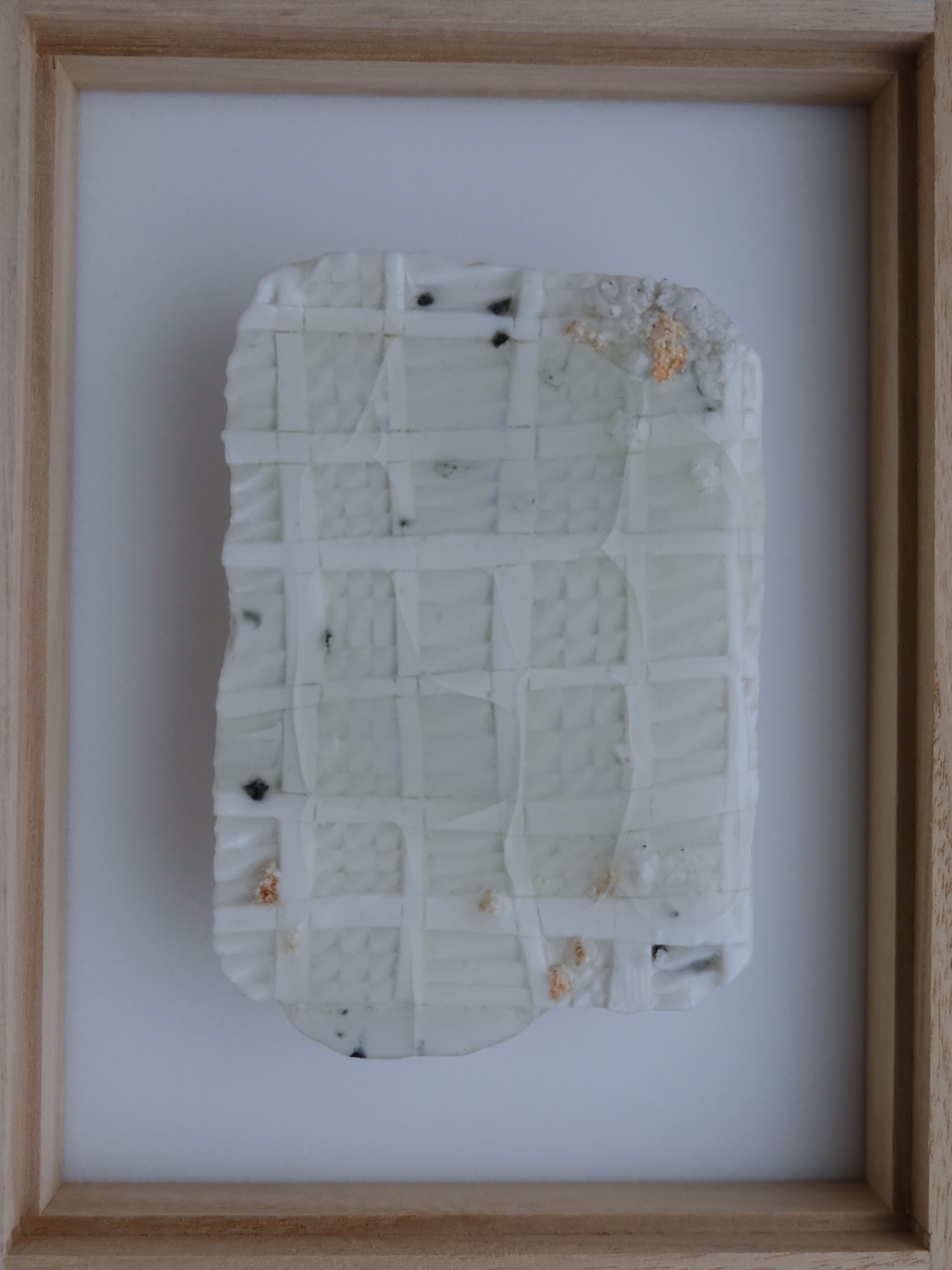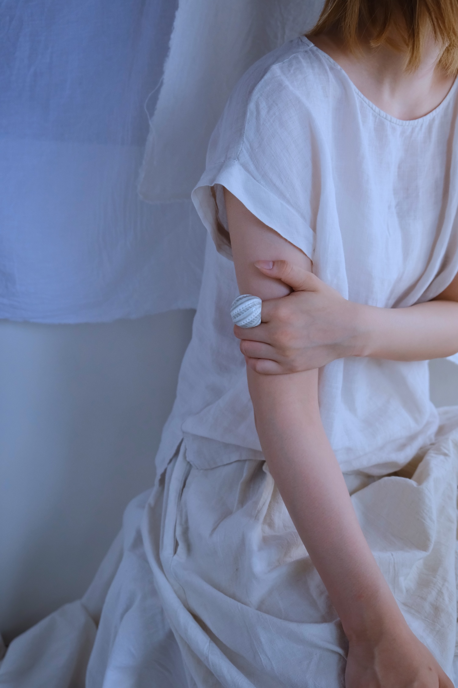「ヒトから生まれたもの、意識や行為、さまざまな人工物が化石化・結晶化したら」という仮定でジュエリーやレリーフを制作し、宝石や鉱物と組成が近い陶磁器という素材に模様を彫り、幾度も線を重ねることでイメージを結晶化させています。