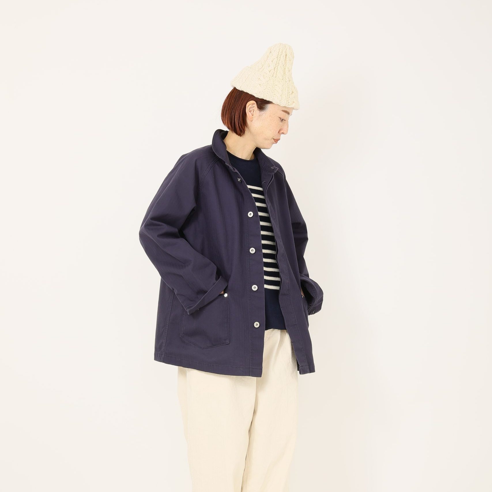 コットンに、落ち綿(おちわた)カシミヤをブレンドした糸を使用したボーダーニットは、綿の取り扱いやすさに加え、カシミヤのタッチをほんのり感じられて、秋口のまだ少し暖かい時期でも活躍できる素材。手洗い可能なところも嬉しい万能なニットです。