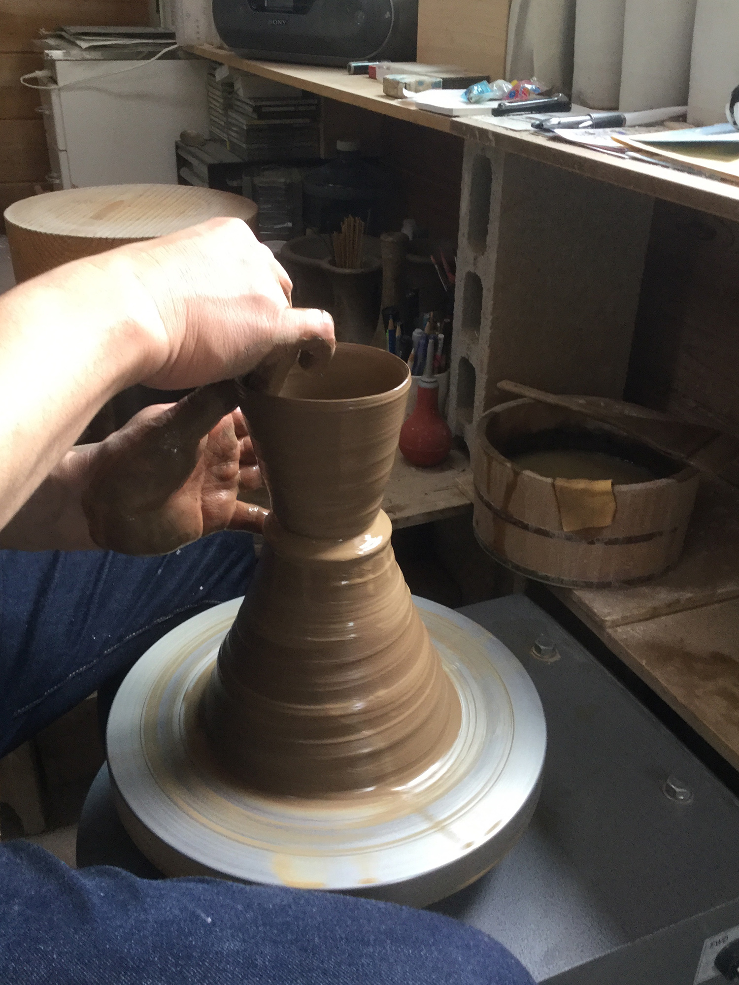 「呼吸感」を具体的に説明するのは難しいのですが──轆轤をひいている時の形の張らせ方とかでしょうか。型を使って作っているものは不思議なのですが、止まって見えるんです。でも、轆轤でひいたものはその人のリズムや息づかいが出ているんですね。轆轤は土をまっすぐ引き上げているように見えるのですが、実際はねじれながら上がっていくんです。紙をくるっと筒状に丸めて中心の芯を引っ張っているイメージですね。引き上げられているけれど、螺旋を描いている。土を練る「菊練り」も中の空気を追い出しながら、土を渦巻状に巻いているんです。巻いた土の芯をそのまま轆轤に据えて、引き上げて成形しているんです。ちょっとずつ、ねじれて螺旋状にのびあがっていく、その運動性が出せるようにしたいと思っています。
