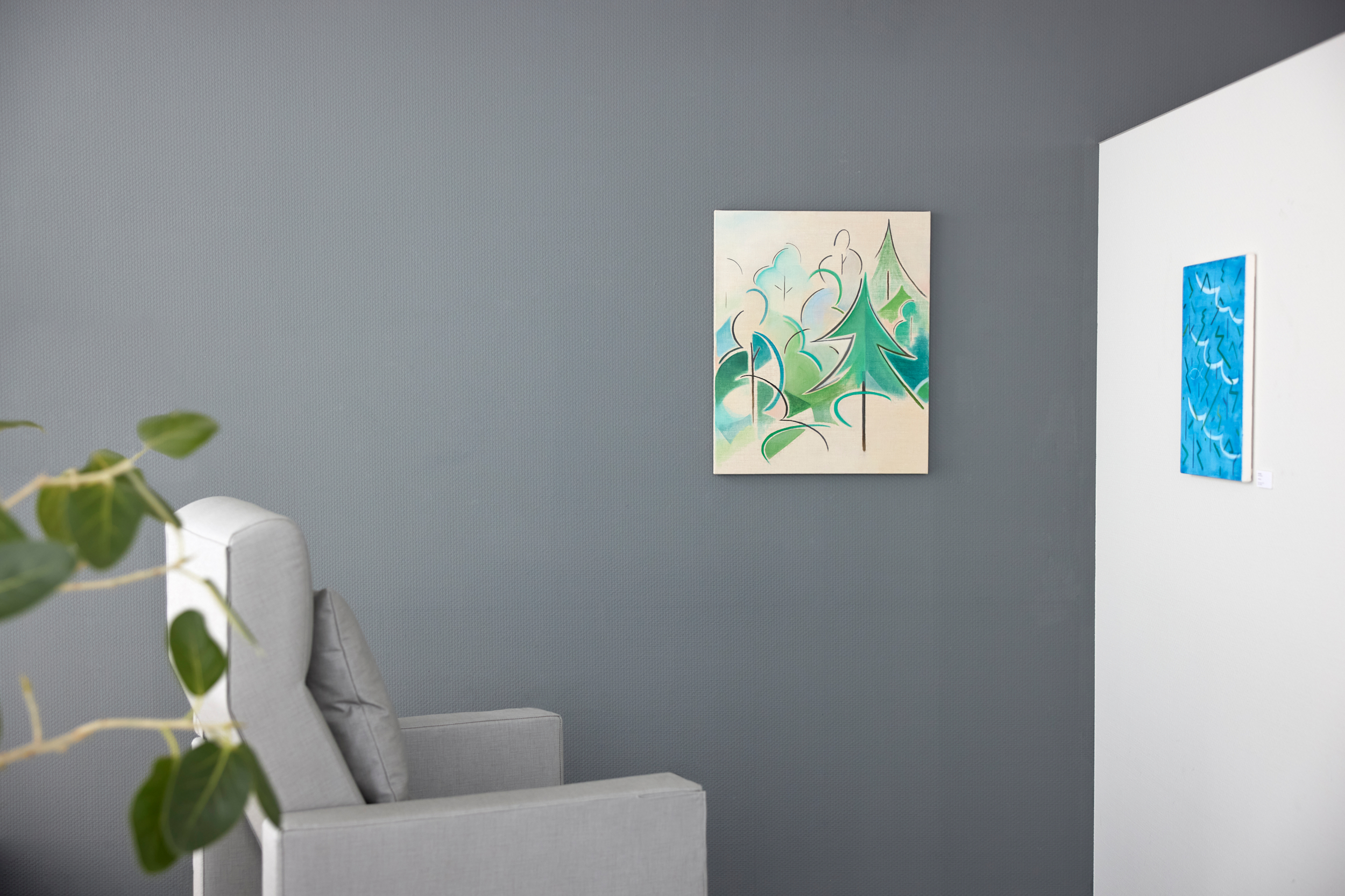 日常で出会う、心を奪われる瞬間を景色として描くだけでなく、コロナ禍以降は、見慣れた風景を観察することで気づくささやかな変化や時間の移ろいを絵画の中で表現しようと試みています。《woods》シリーズでは、風の揺らぎや歩みによって変化する木々の輪郭を、記号のようにすっきりとした線と面で構成しています。是非ご覧ください。